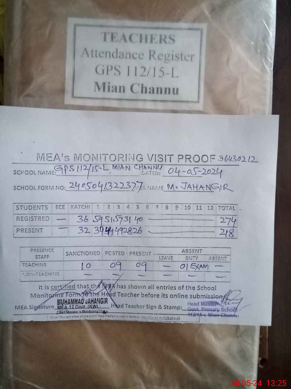 | EMIS Code: 36430212 | Name of School: GPS 112/15-L, MIAN CHANNU | |||