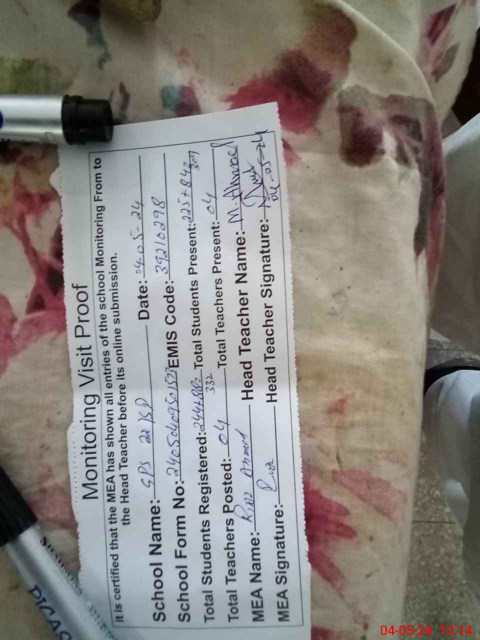 | Attendance Register | Head Teacher | MEA with School | Visit Proof |