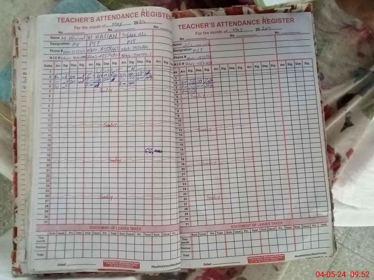 | CNIC | Full Name | Designation | R/C | Absence During Last Calender Month |
