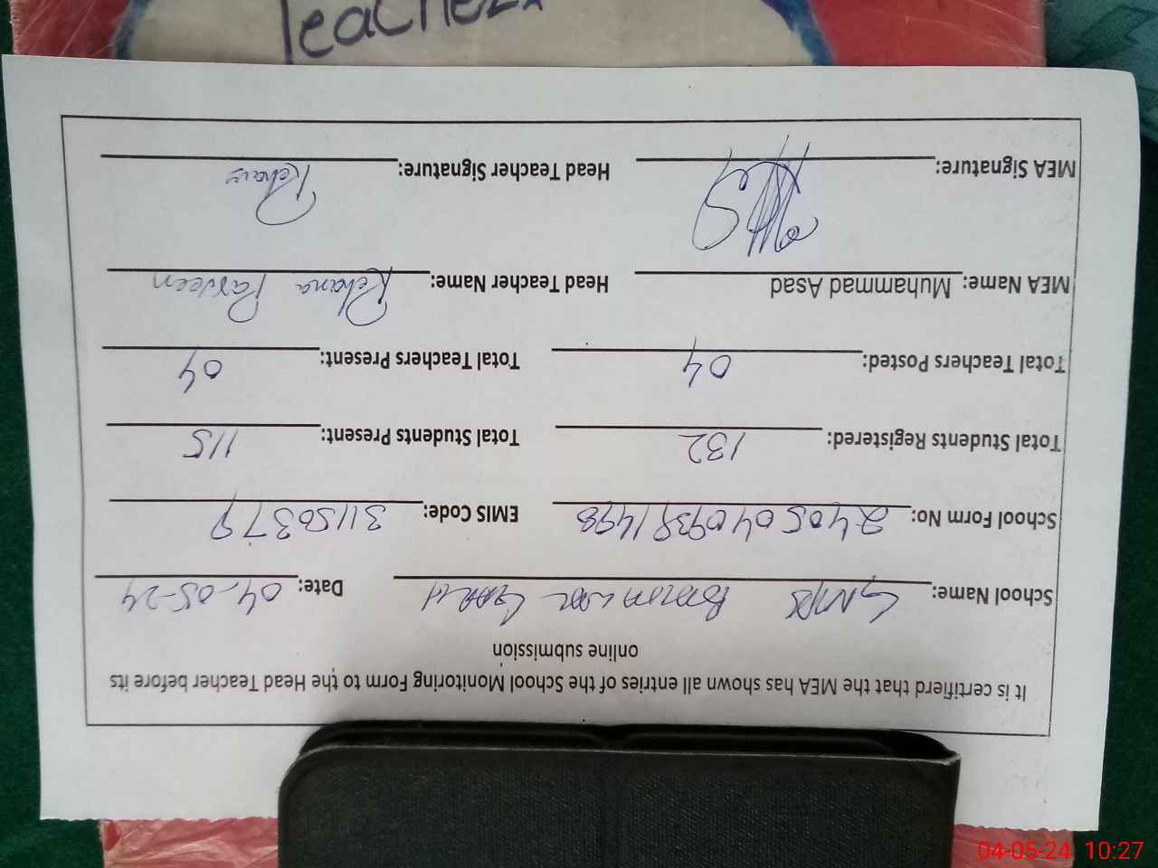 | Attendance Register | Head Teacher | MEA with School | Visit Proof |