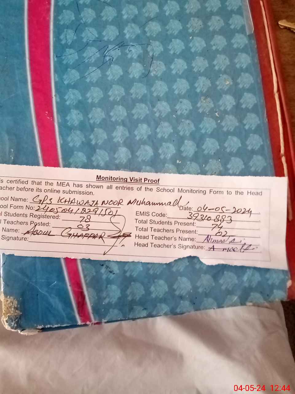 | Attendance Register | Head Teacher | MEA with School | Visit Proof |