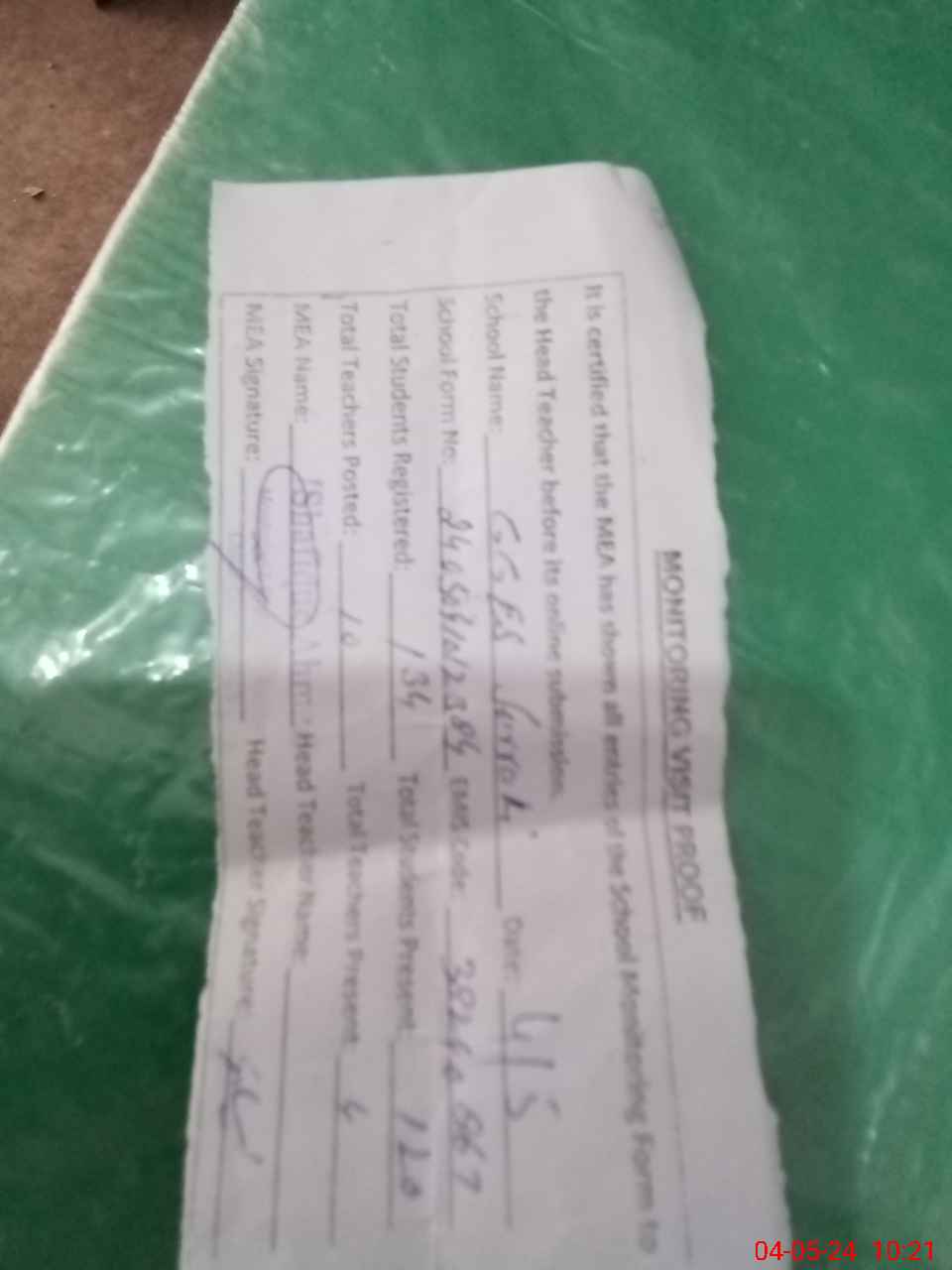 | Attendance Register | Head Teacher | MEA with School | Visit Proof |