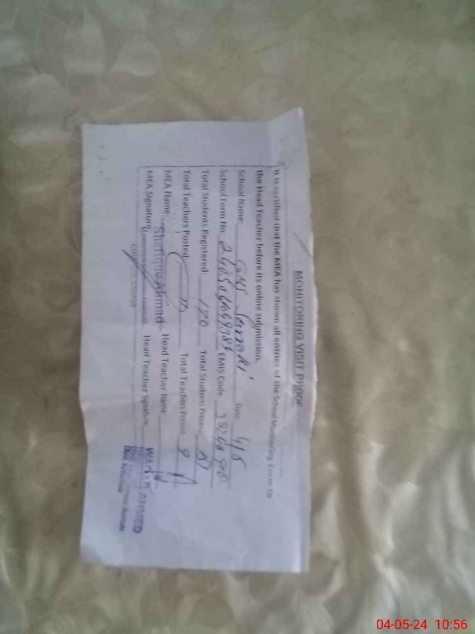 | Attendance Register | Head Teacher | MEA with School | Visit Proof |
