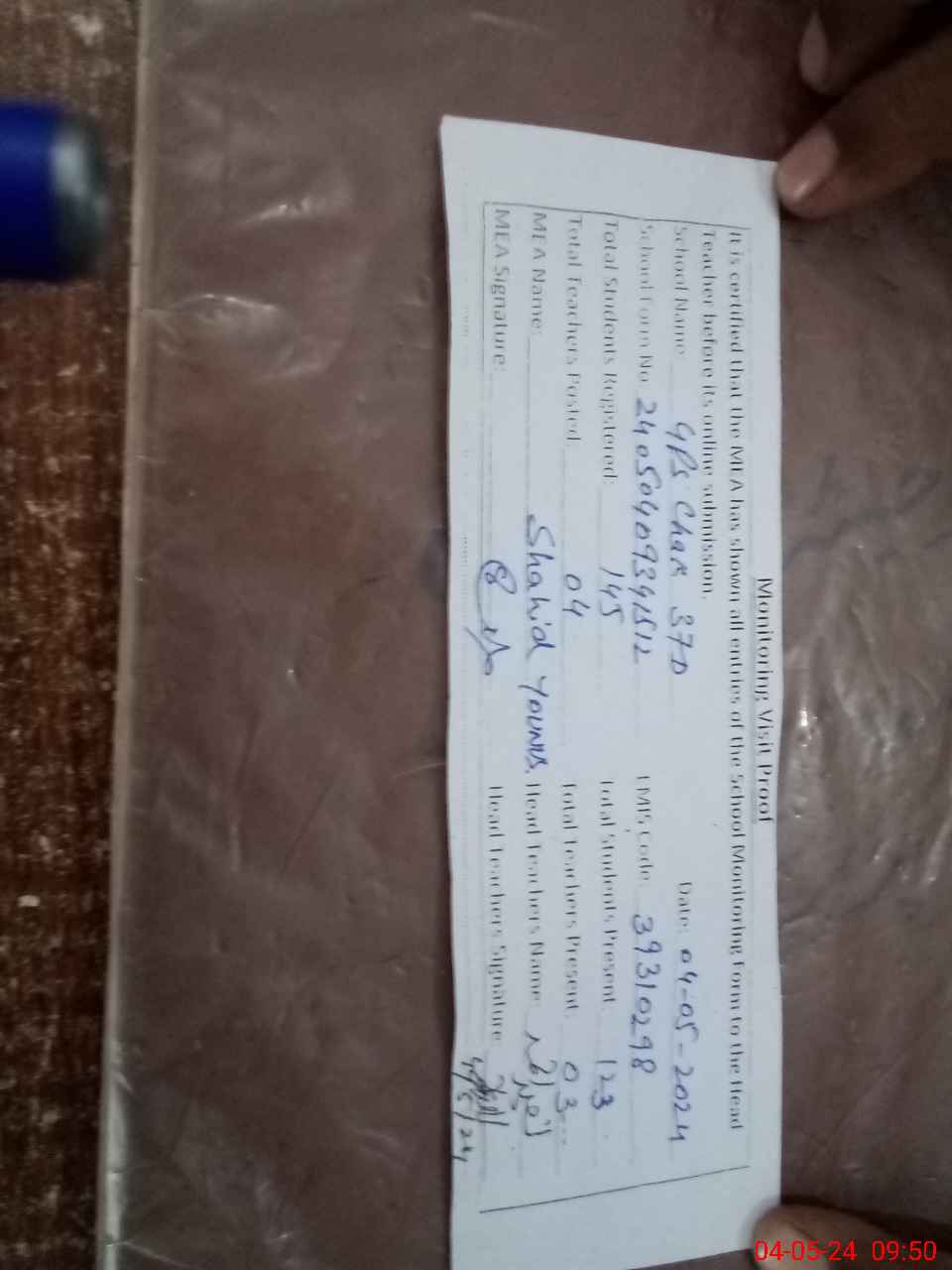 | Attendance Register | Head Teacher | MEA with School | Visit Proof |