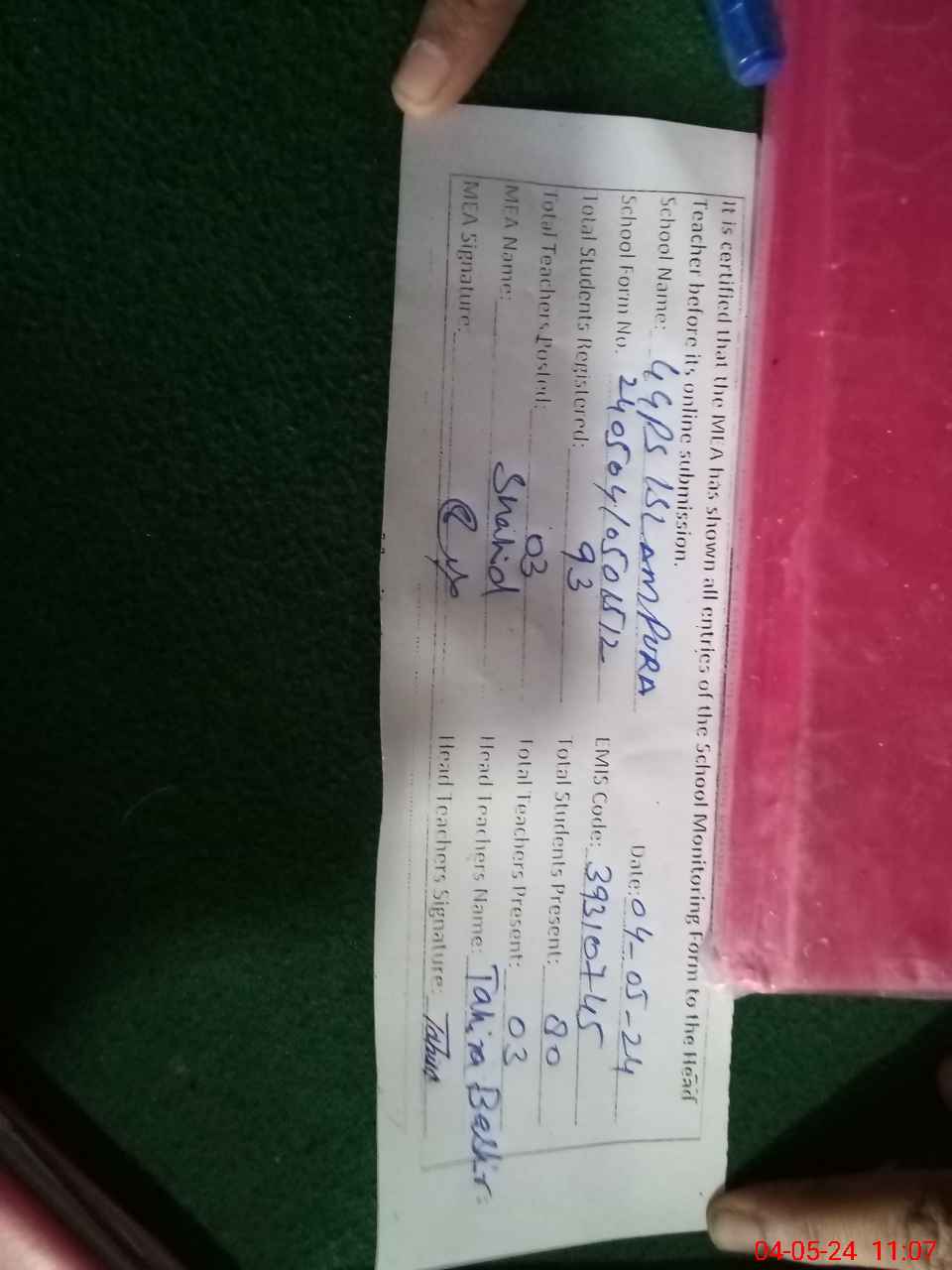 | Name: Ta**** Ba**** Designation: (School Headmaster's/Headmistress's) PST Phone/Cell Number: 03**** |