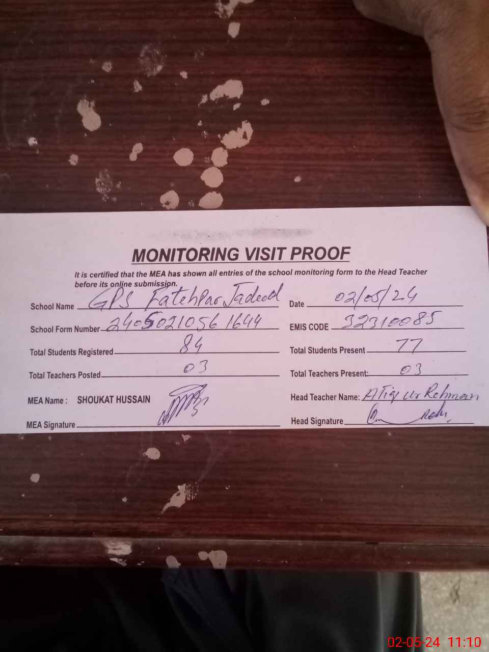 | EMIS Code: 32310085 | Name of School: GPS FATEH PUR JADEED | |||