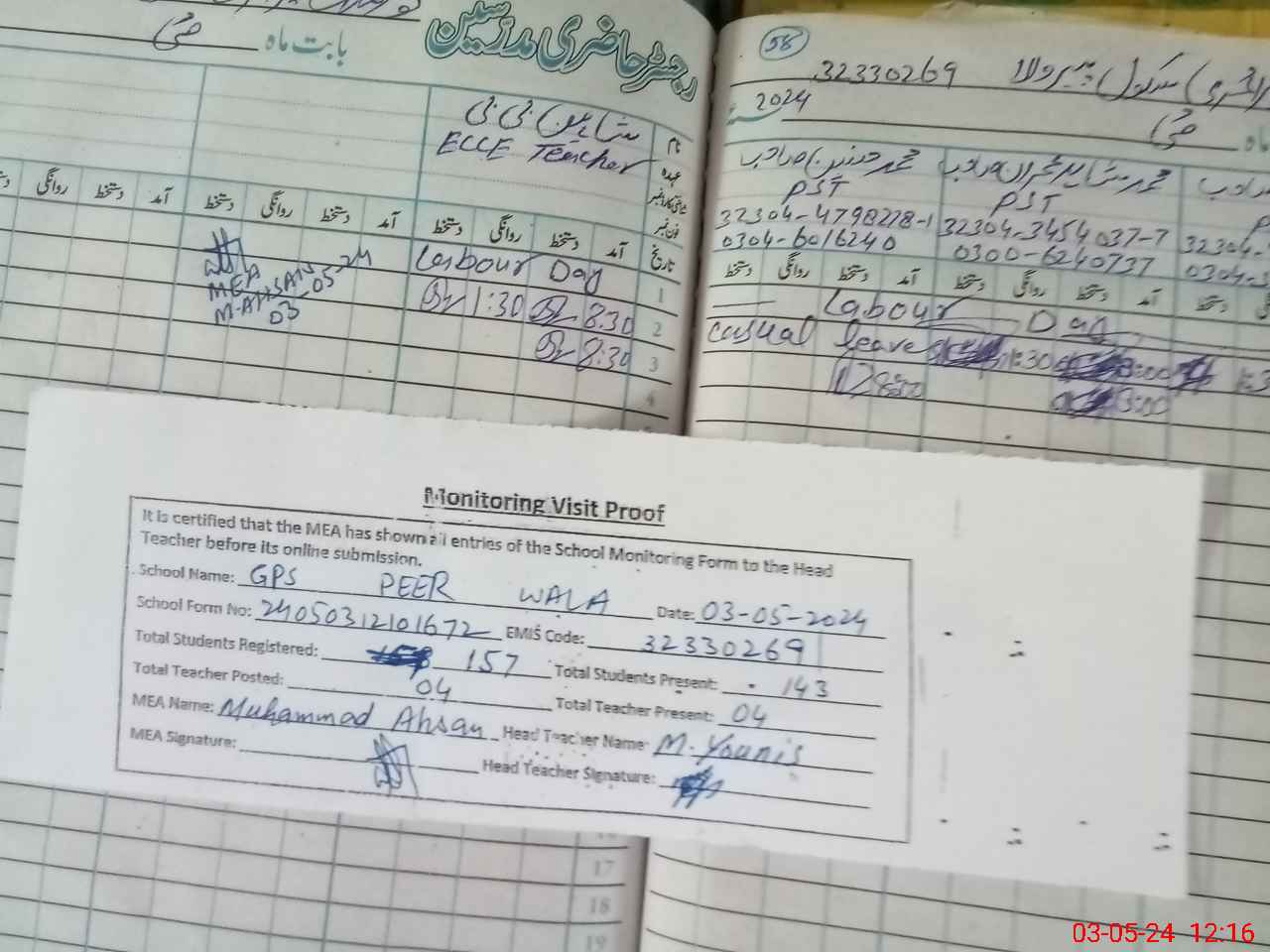 | Attendance Register | Head Teacher | MEA with School | Visit Proof |