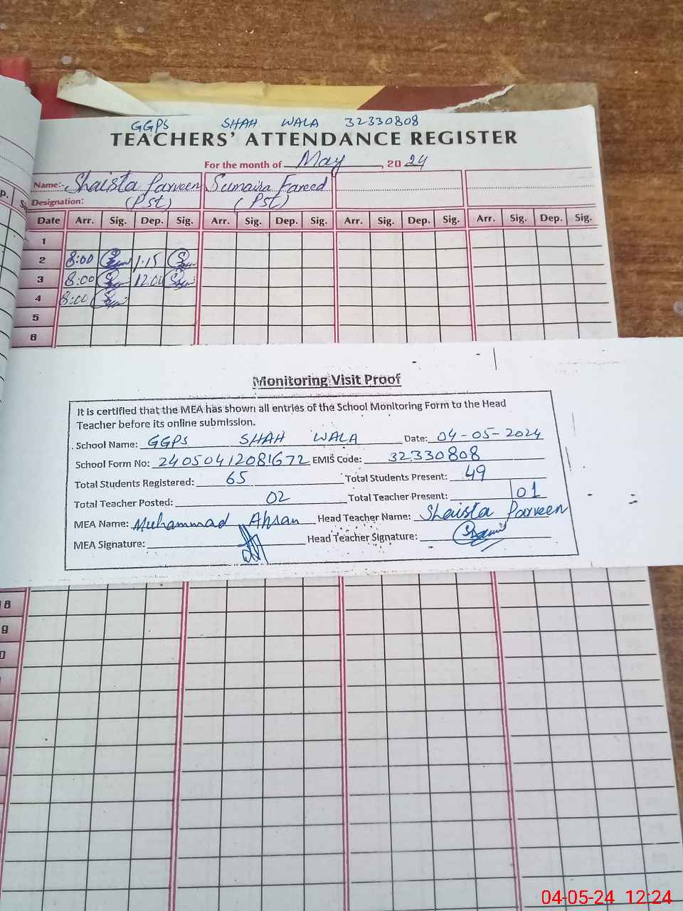 | Attendance Register | Head Teacher | MEA with School | Visit Proof |