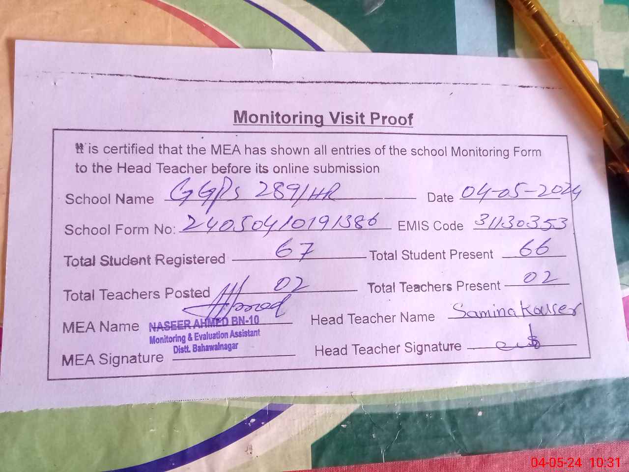 | EMIS Code: 31130353 | Name of School: GGPS CHAK NO 289 HR | |||