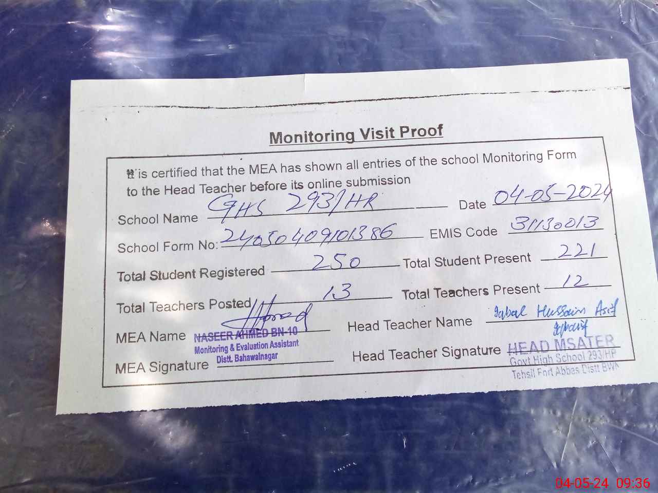 | EMIS Code: 31130013 | Name of School: GHS CHAK 293/HR | |||