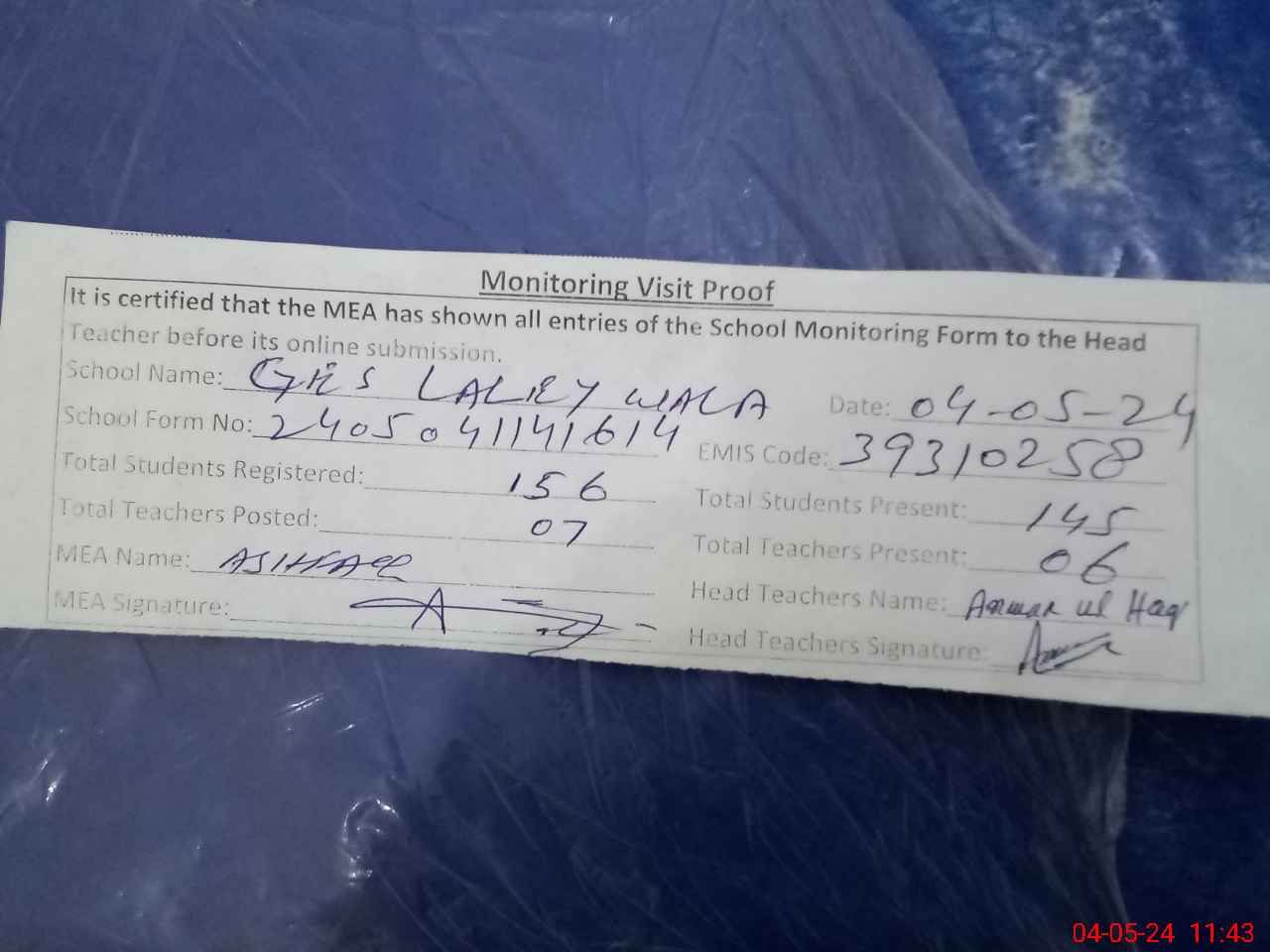 | Attendance Register | Head Teacher | MEA with School | Visit Proof |