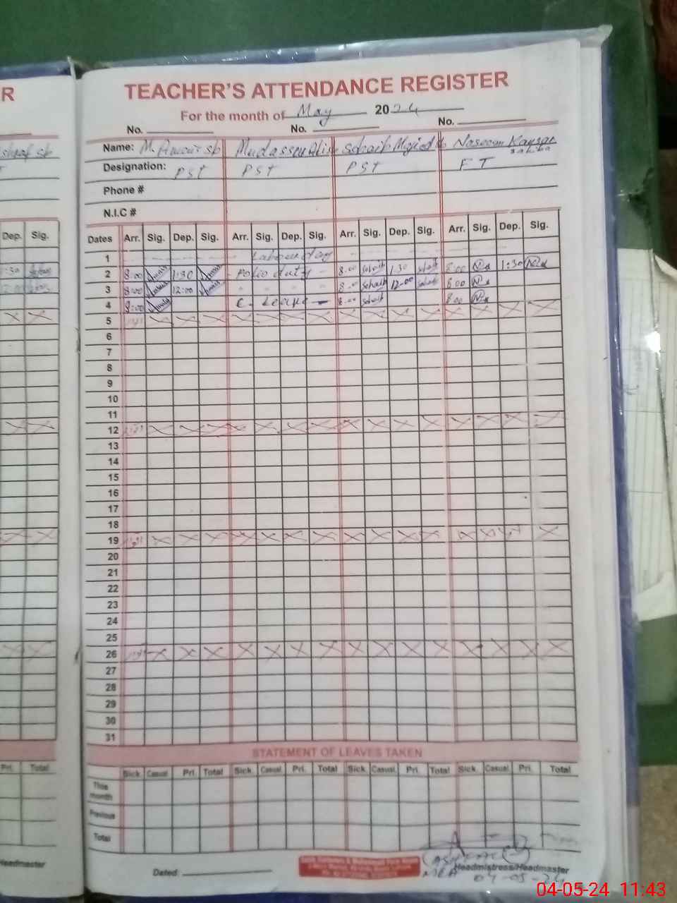 | Leave | Duty | Absent | Maternity | Medical | Ex- Pak |