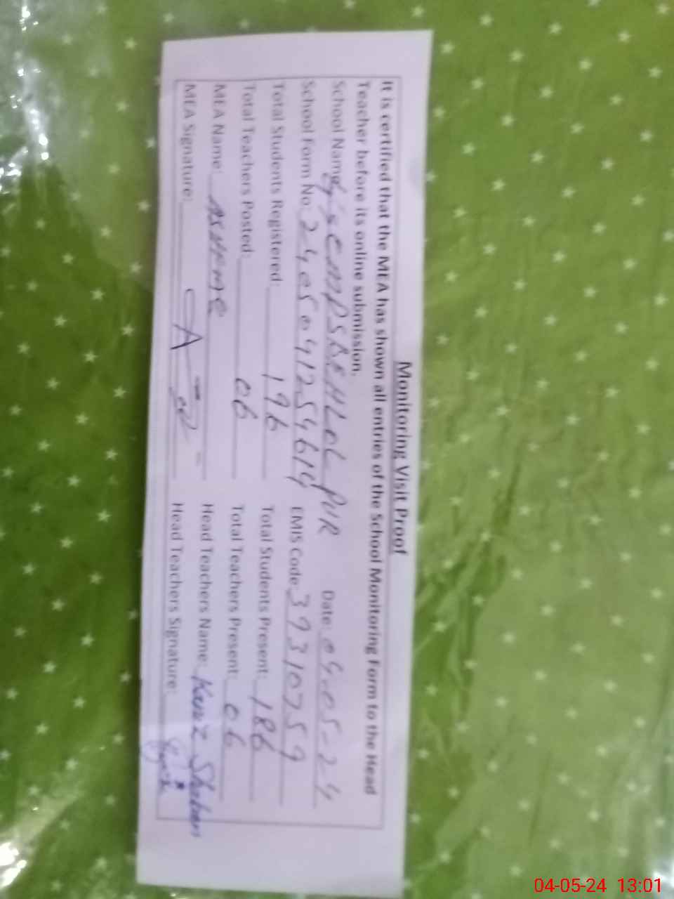 | Attendance Register | Head Teacher | MEA with School | Visit Proof |
