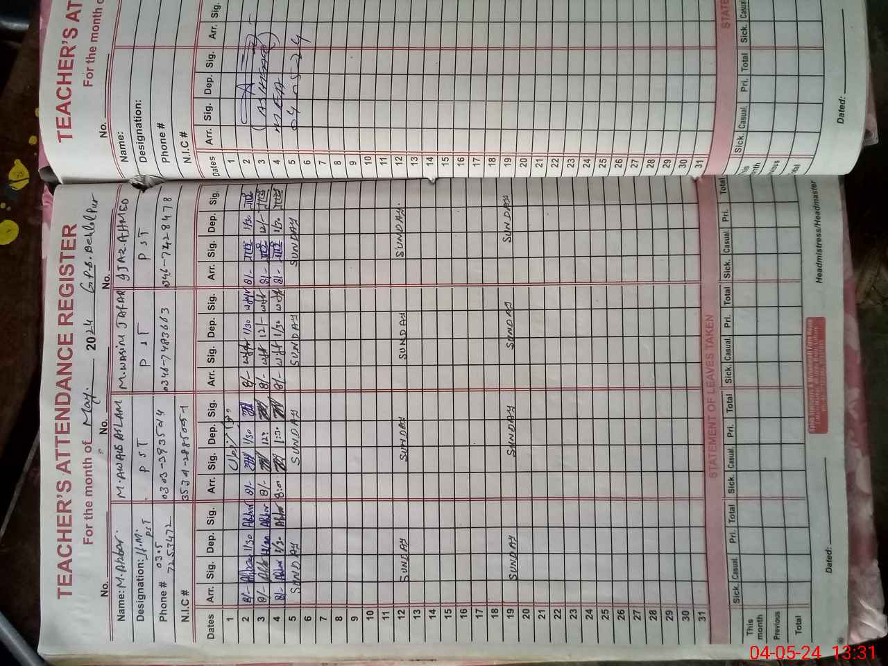 | Name: Mu**** Ak**** Designation: (School Headmaster's/Headmistress's) PTC/ Phone/Cell Number: 03**** |