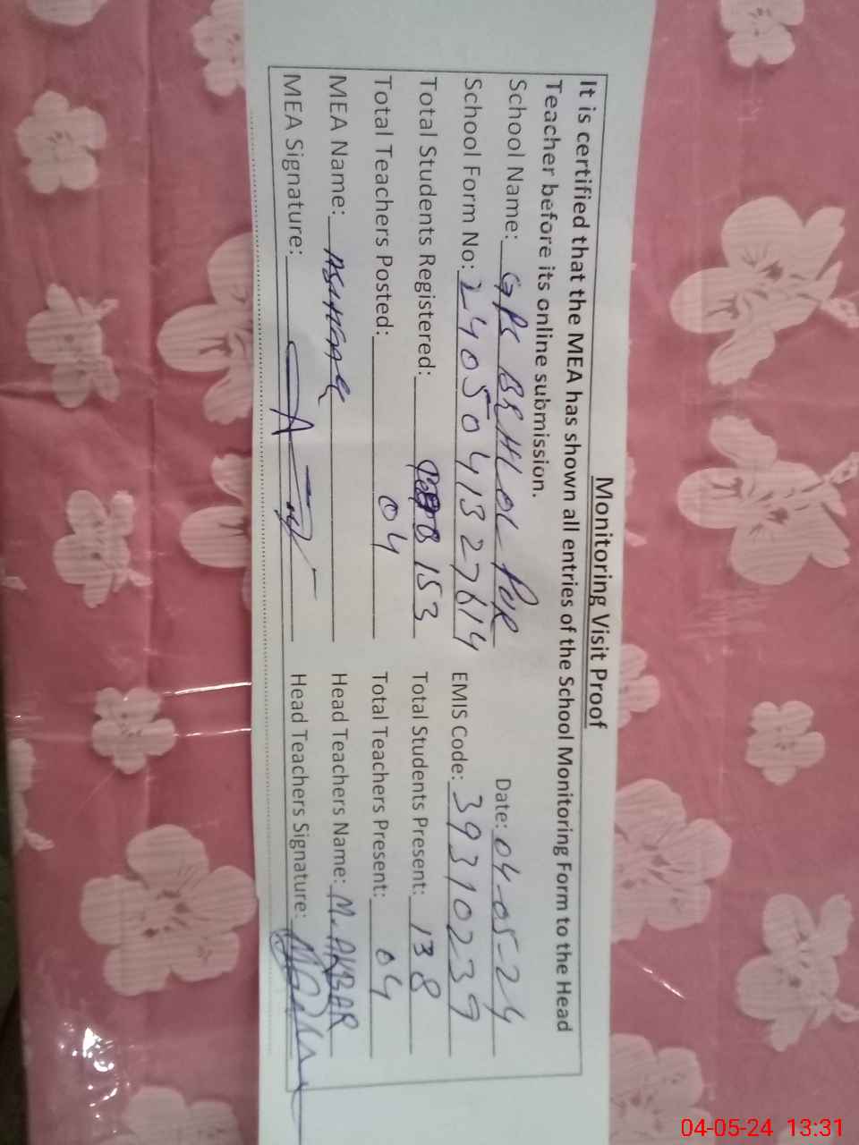 | Attendance Register | Head Teacher | MEA with School | Visit Proof |
