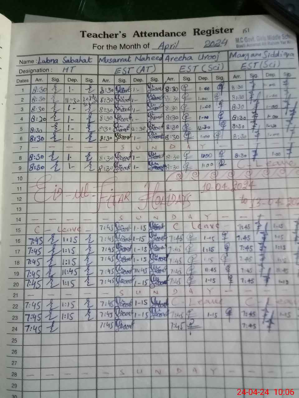 | Monitoring Date: 24-04-2024 | Start Time: 24-04-2024 09:44 AM | End Time: 24-04-2024 10:11 AM | Name of MEA: Ma**** UlHa**** | |