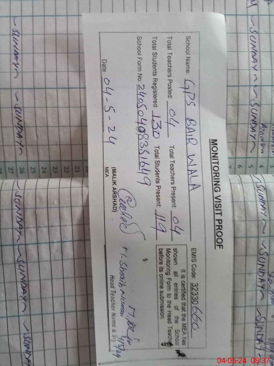 | EMIS Code: 32330660 | Name of School: GPS BAIR WALA | |||