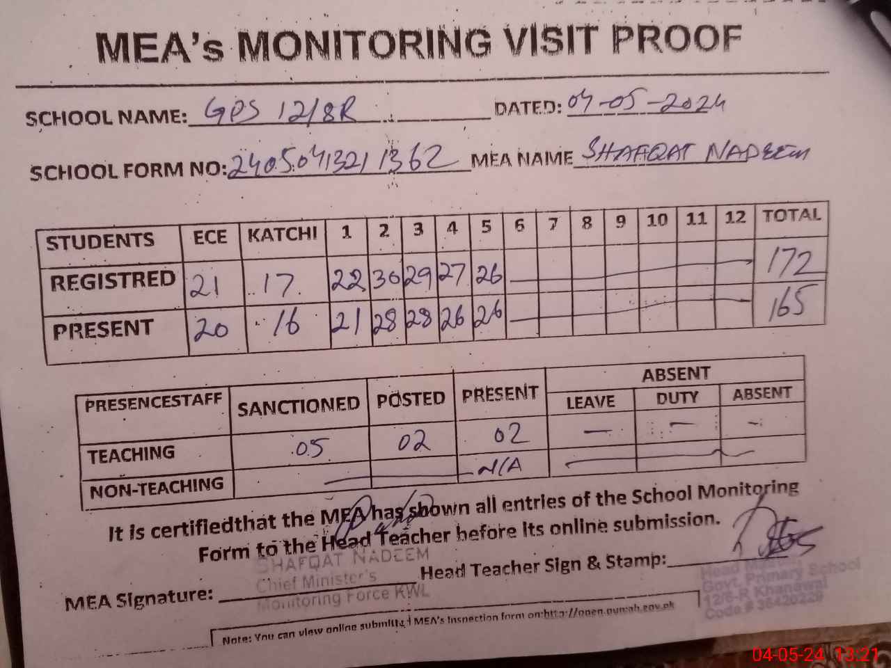 | Attendance Register | Head Teacher | MEA with School | Visit Proof |