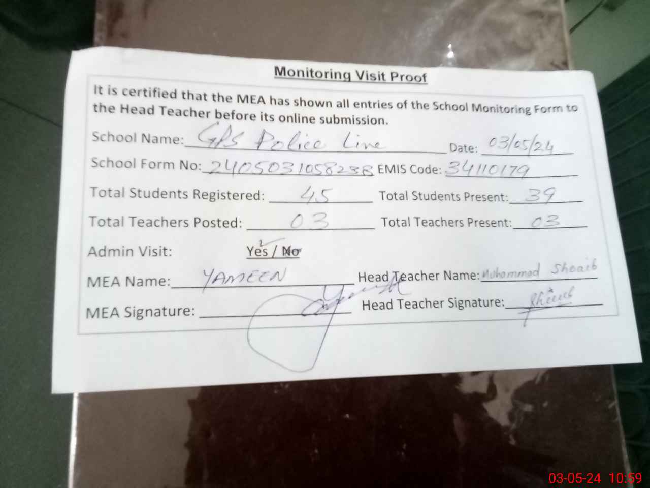 | Monitoring Date: 03-05-2024 | Start Time: 03-05-2024 10:20 AM | End Time: 03-05-2024 11:05 AM | Name of MEA: C-**** Ya**** | |