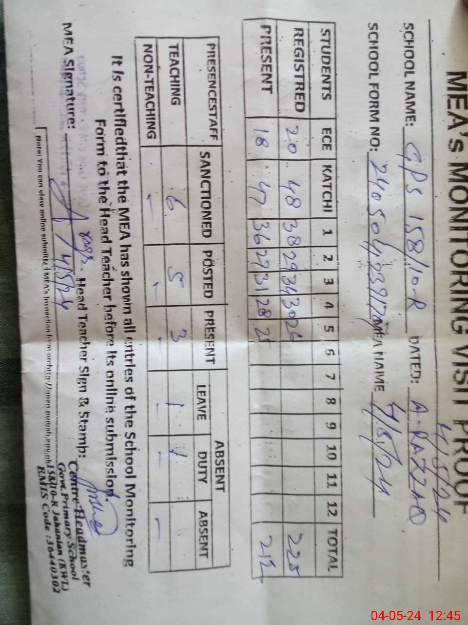 | Attendance Register | Head Teacher | MEA with School | Visit Proof |