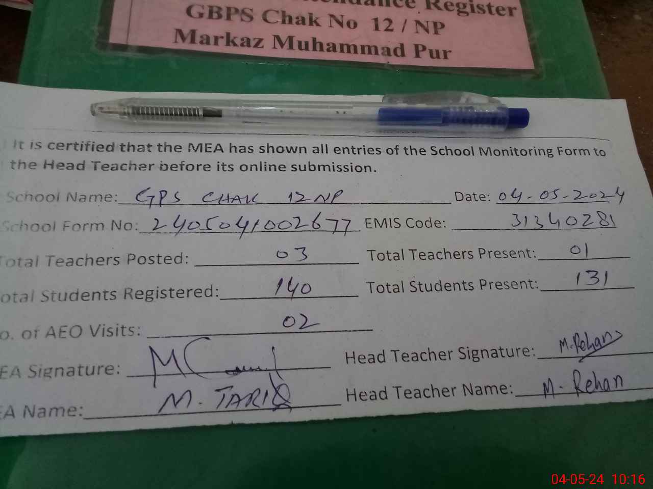 | Attendance Register | Head Teacher | MEA with School | Visit Proof |