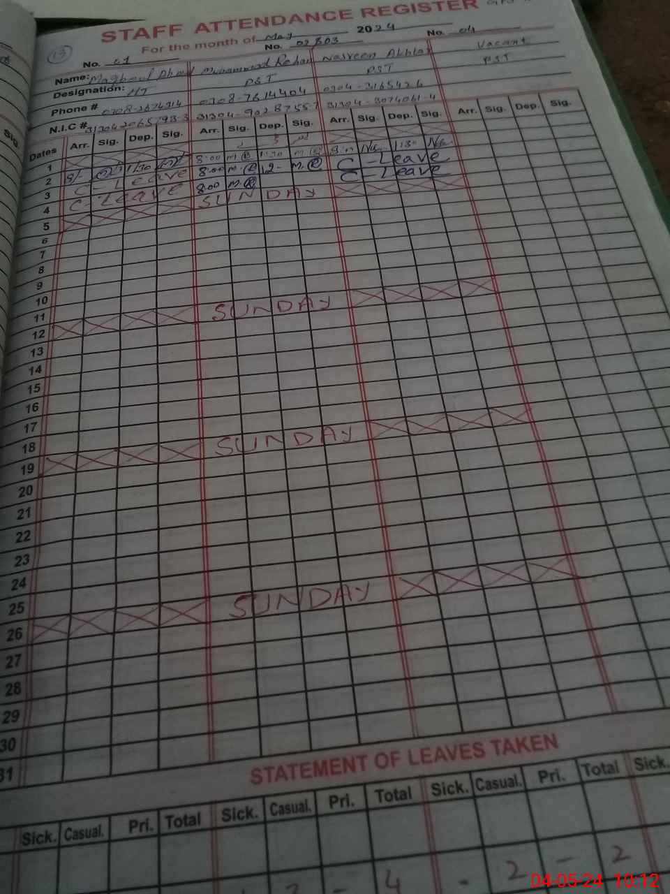| CNIC | Full Name | Designation | R/C | Absence During Last Calender Month |
