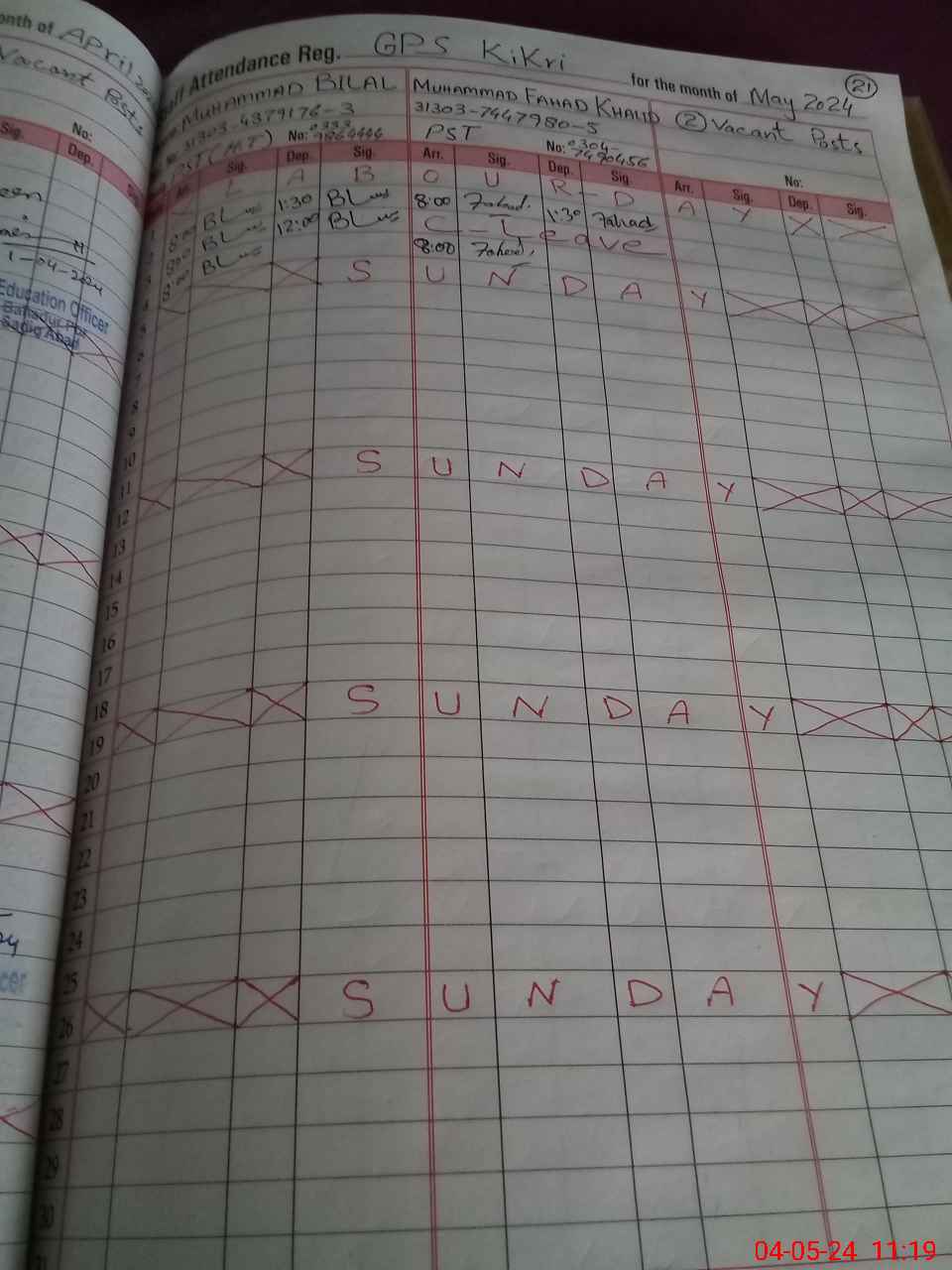 | CNIC | Full Name | Designation | R/C | Absence during last cal. month |