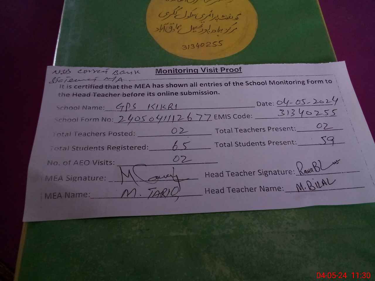 | Attendance Register | Head Teacher | MEA with School | Visit Proof |