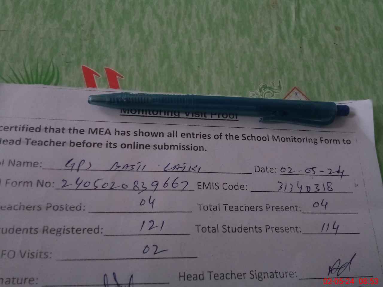 | Attendance Register | Head Teacher | MEA with School | Visit Proof |