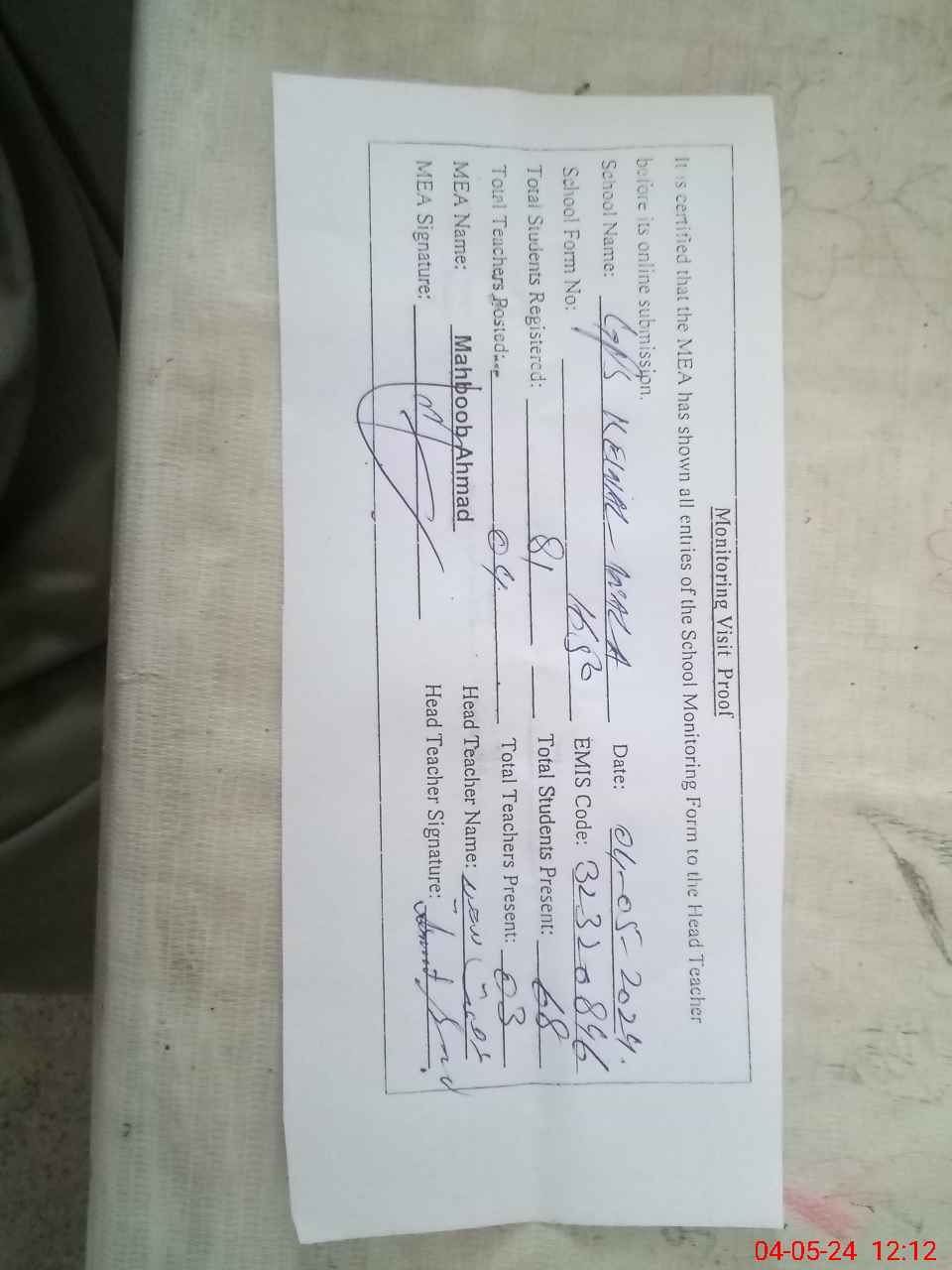 | Attendance Register | Head Teacher | MEA with School | Visit Proof |