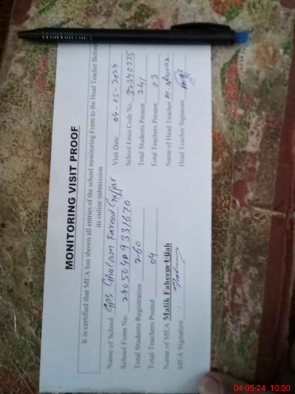 | Attendance Register | Head Teacher | MEA with School | Visit Proof |