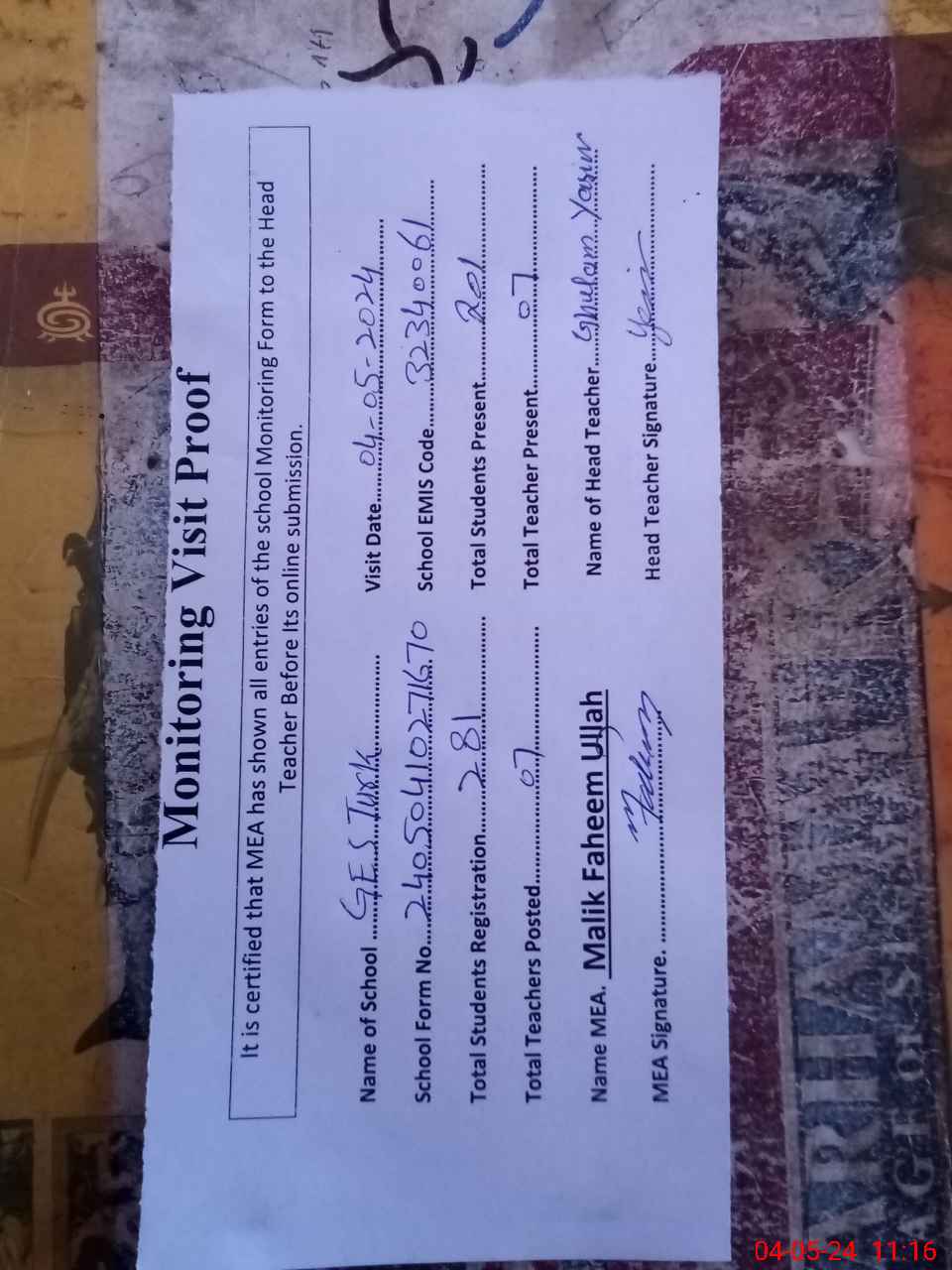 | Attendance Register | Head Teacher | MEA with School | Visit Proof |