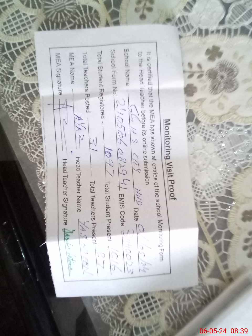 | Attendance Register | Head Teacher | MEA with School | Visit Proof |