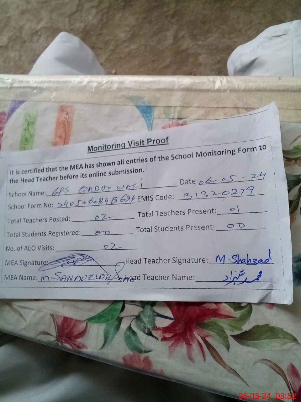 | Attendance Register | Head Teacher | MEA with School | Visit Proof |
