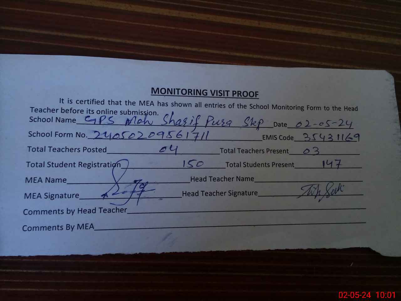| Attendance Register | Head Teacher | MEA with School | Visit Proof |