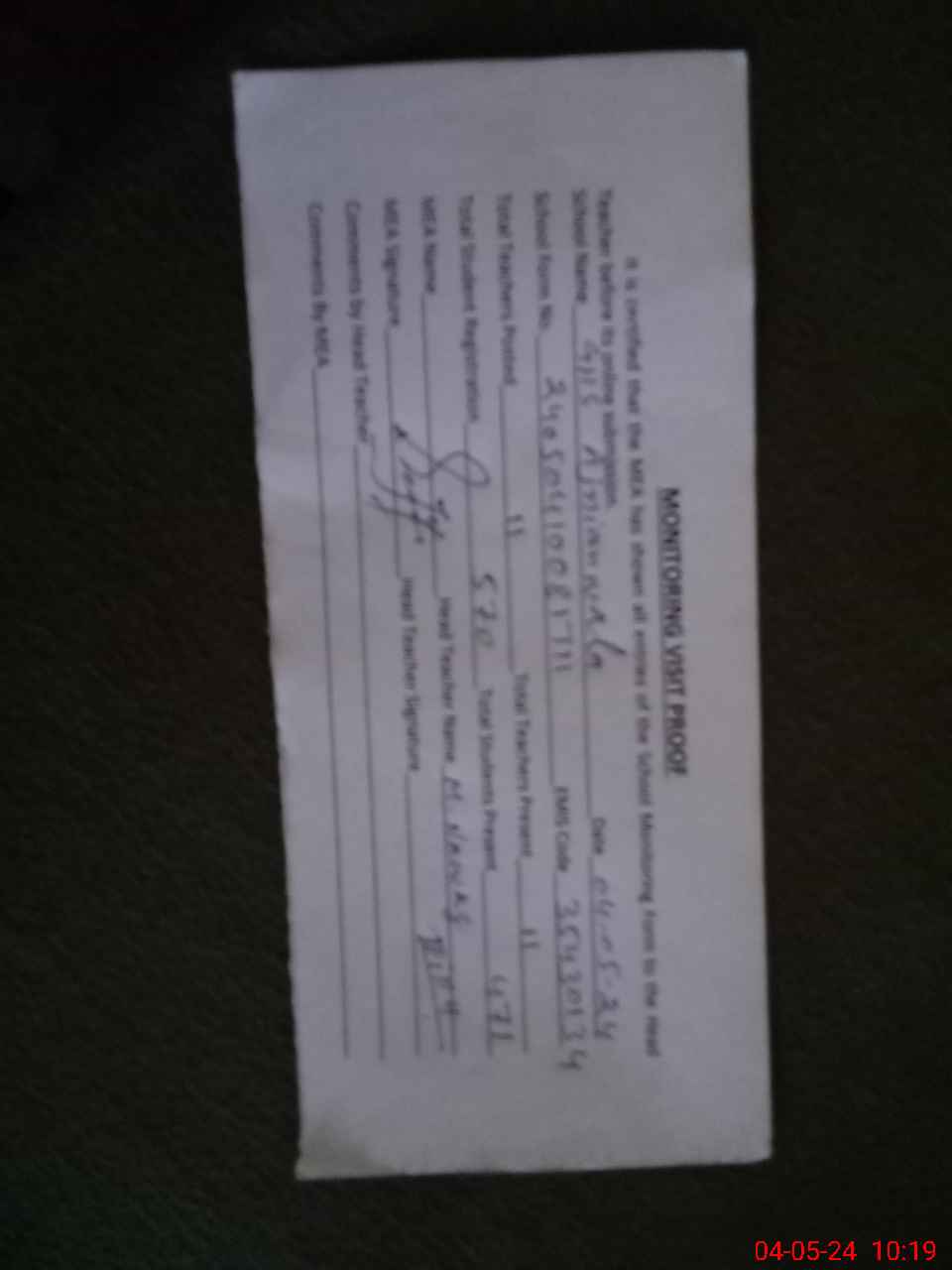 | Attendance Register | Head Teacher | MEA with School | Visit Proof |