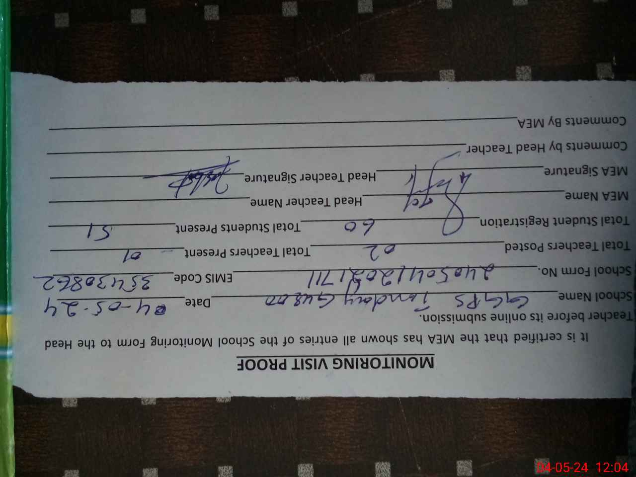 | Attendance Register | Head Teacher | MEA with School | Visit Proof |