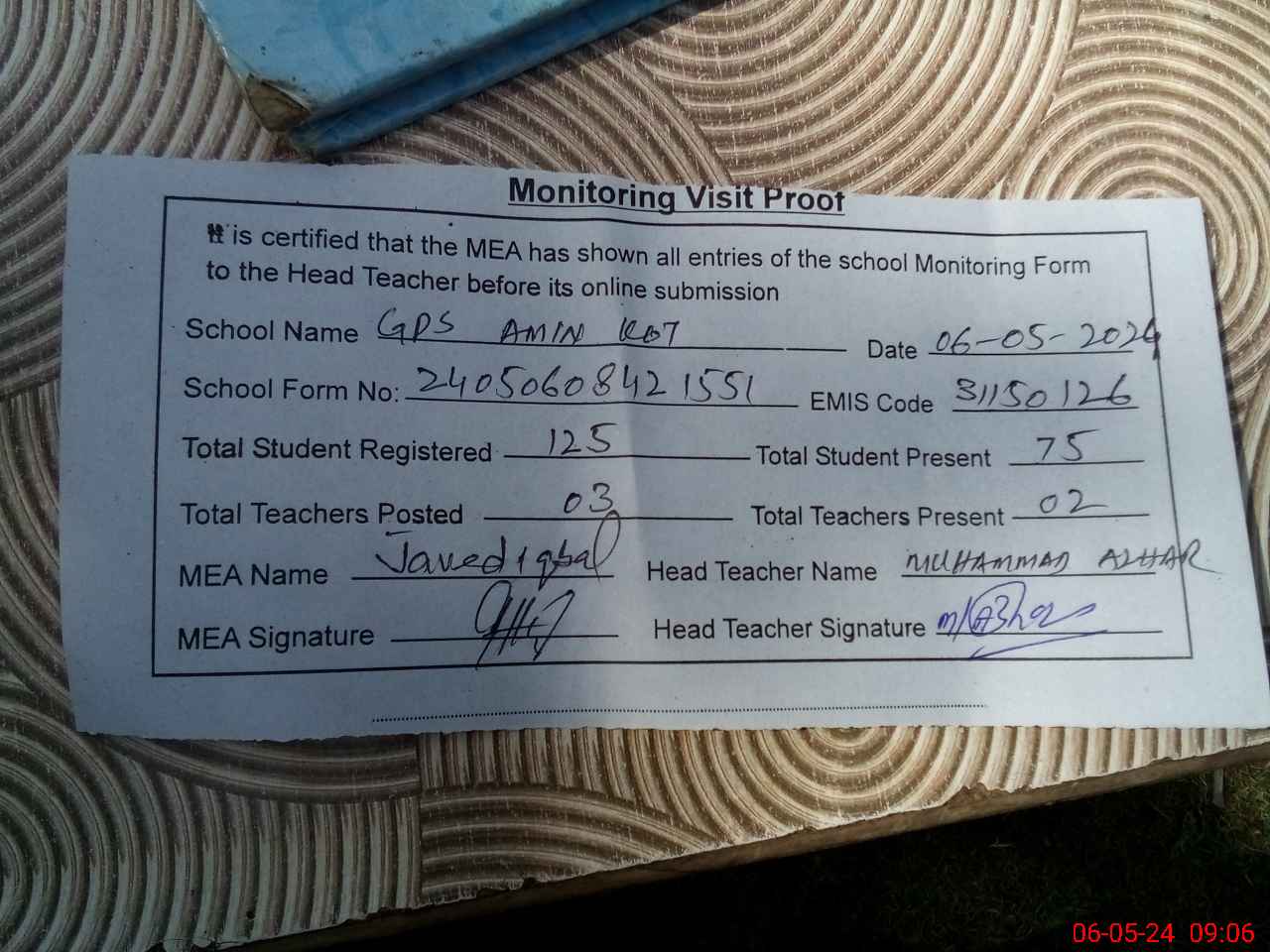 | EMIS Code: 31150126 | Name of School: GPS AMIN KOT | |||