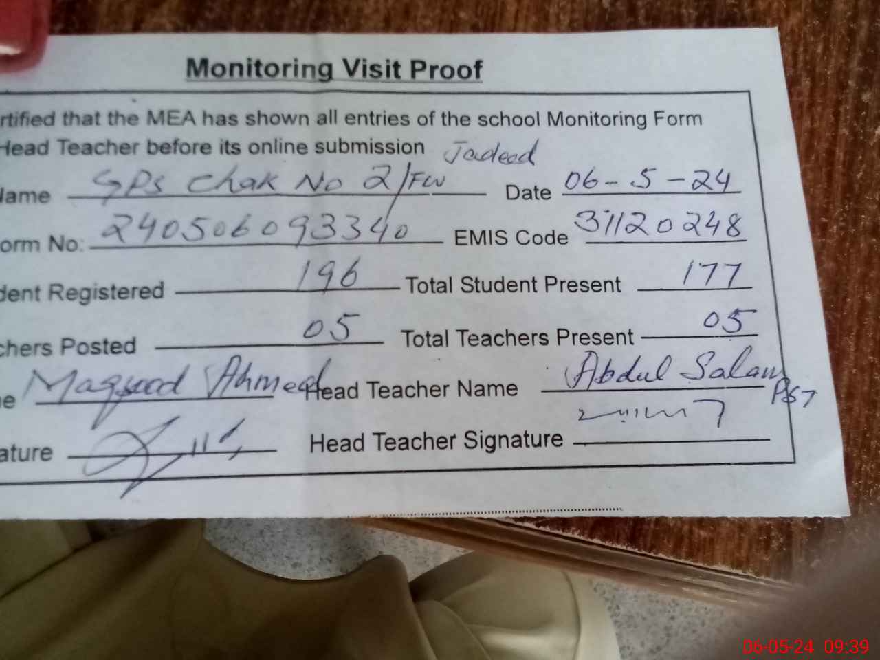 | EMIS Code: 31120248 | Name of School: GPS CHAK NO. 2/FW (JADEED) | |||