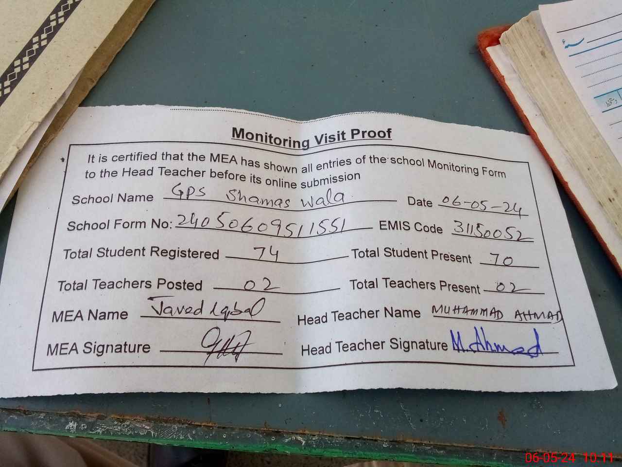 | Attendance Register | Head Teacher | MEA with School | Visit Proof |
