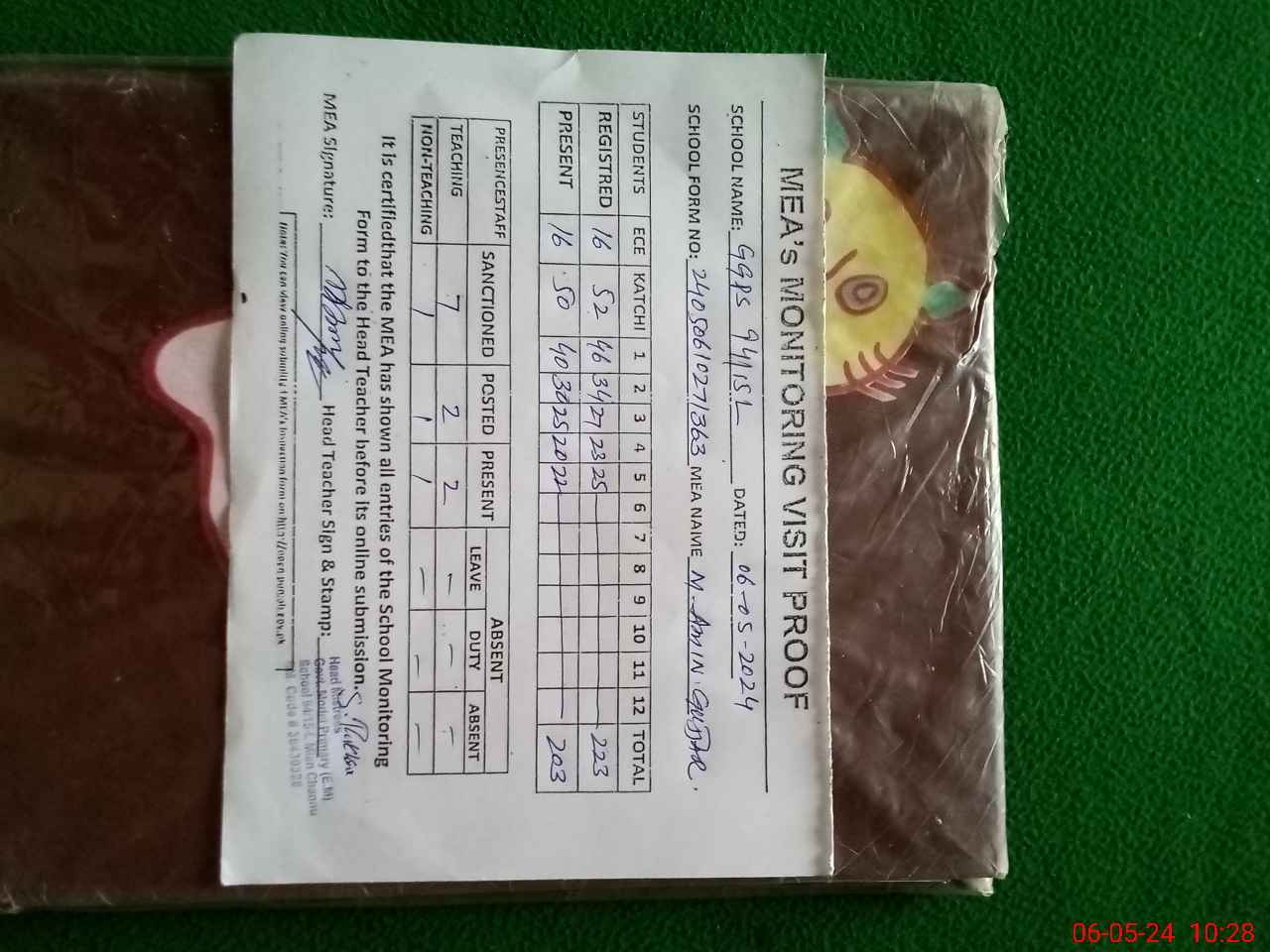 | Attendance Register | Head Teacher | MEA with School | Visit Proof |