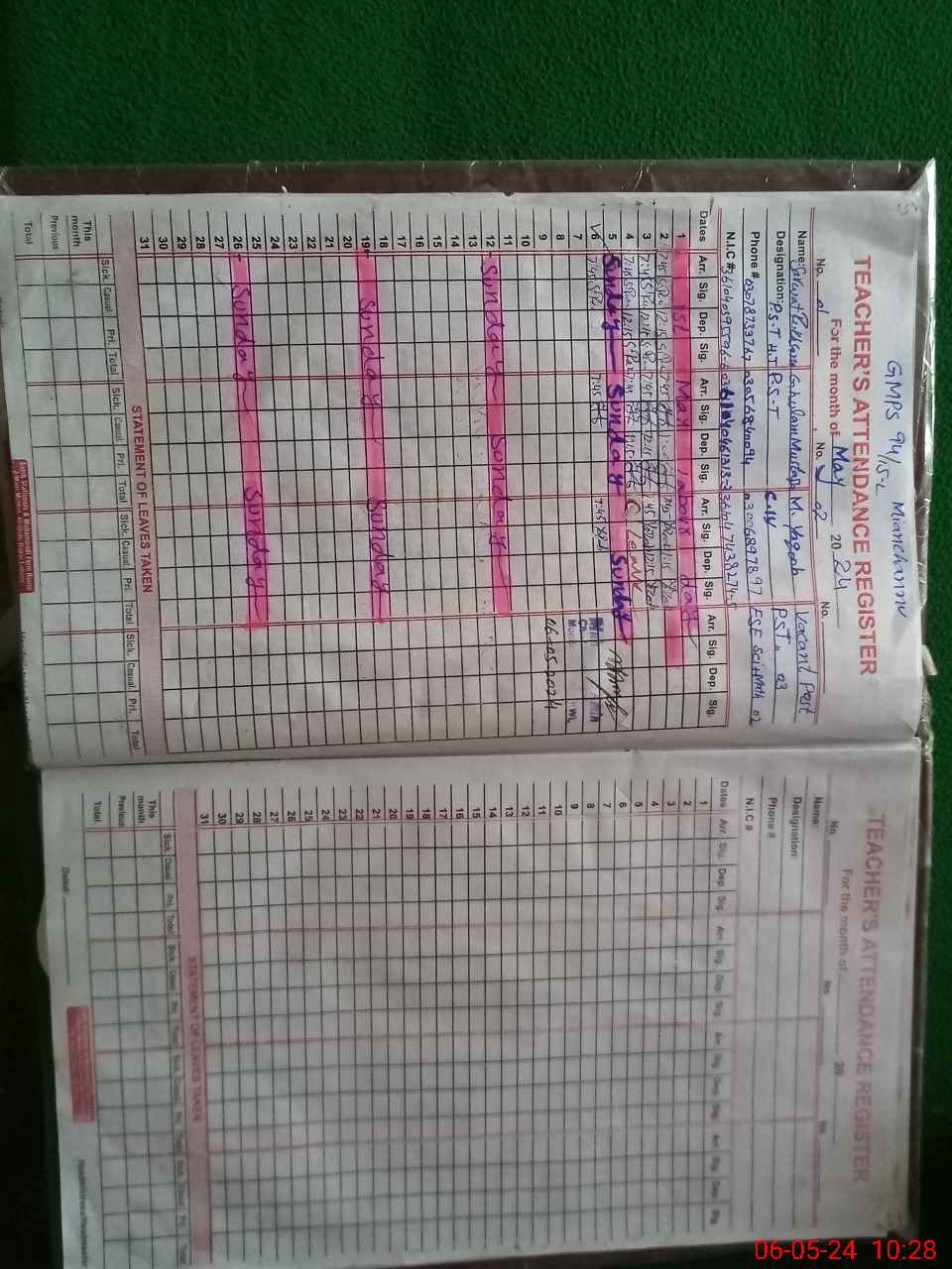 | Name: SA**** RU**** Designation: (School Headmaster's/Headmistress's) PST Phone/Cell Number: 03**** |