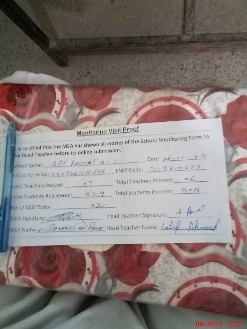 | EMIS Code: 31320237 | Name of School: GPS REHMAT ALI AMIN ABAD | |||