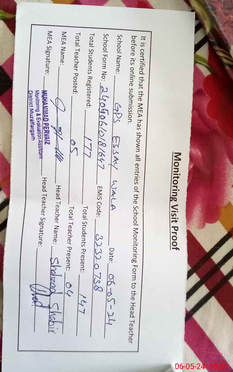 | EMIS Code: 32320738 | Name of School: GPS EESAY WALA | |||