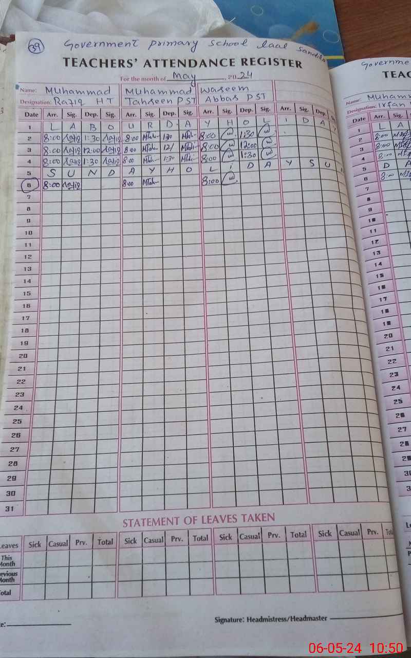 | CNIC | Full Name | Designation | R/C | Absence During Last Calender Month |