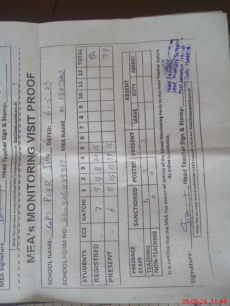 | Attendance Register | Head Teacher | MEA with School | Visit Proof |