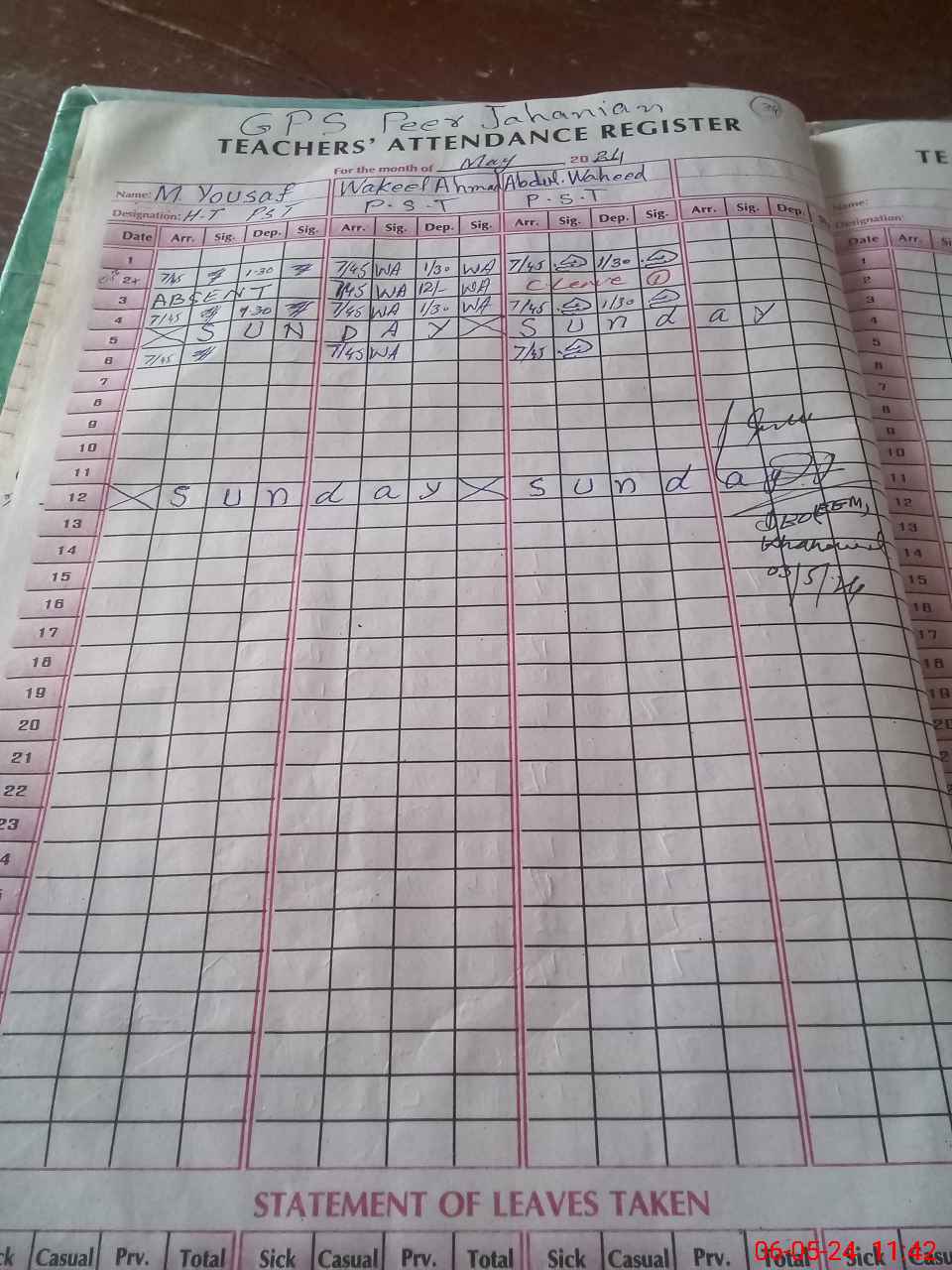 | CNIC | Full Name | Designation | R/C | Absence During Last Calender Month |