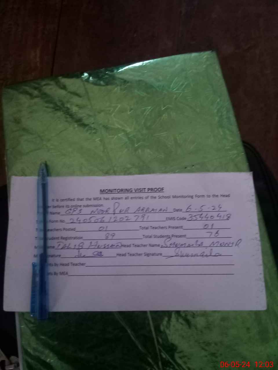 | Attendance Register | Head Teacher | MEA with School | Visit Proof |