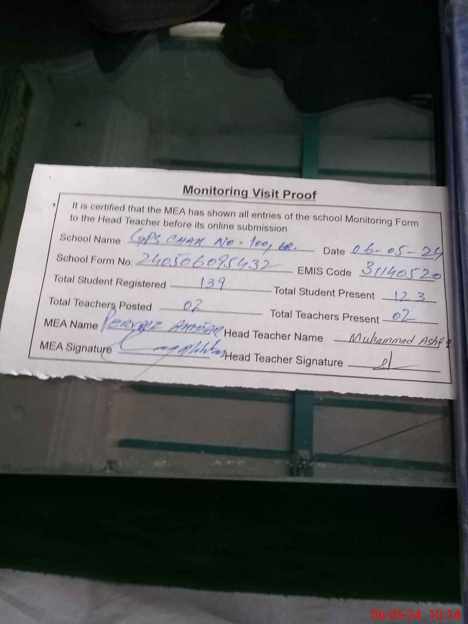 | EMIS Code: 31140520 | Name of School: GPS CHAK NO. 100/6-R | |||