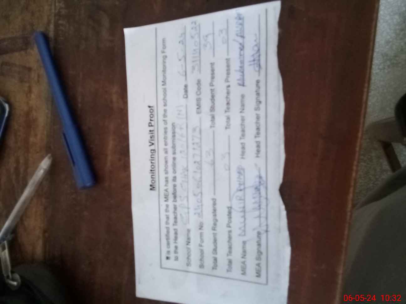 | Attendance Register | Head Teacher | MEA with School | Visit Proof |